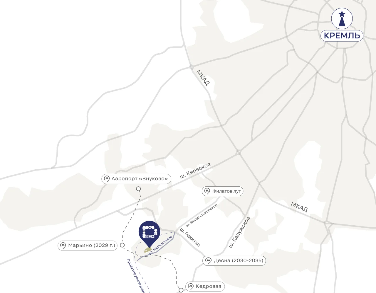 В соответствии с утвержденным проектом развития участка улично-дорожной сети «Саларьево-Московский-Марьино» (на основании постановления Правительства Москвы № 736-ПП от 15.11.2016 г.) до 2027 года запланирован комплекс мероприятий, направленных на кардинальное улучшение транспортной инфраструктуры: