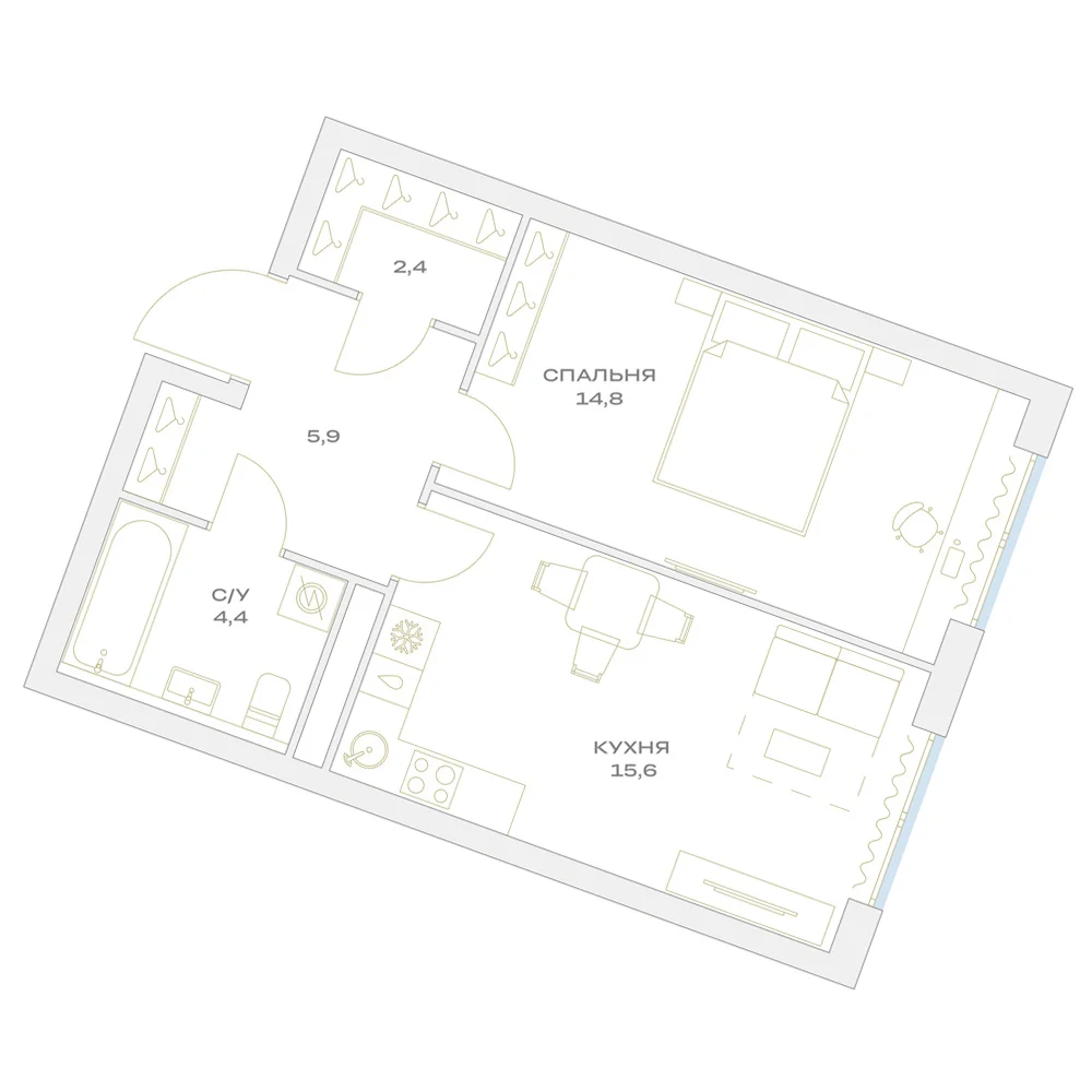 1-комнатная  47.6 м2