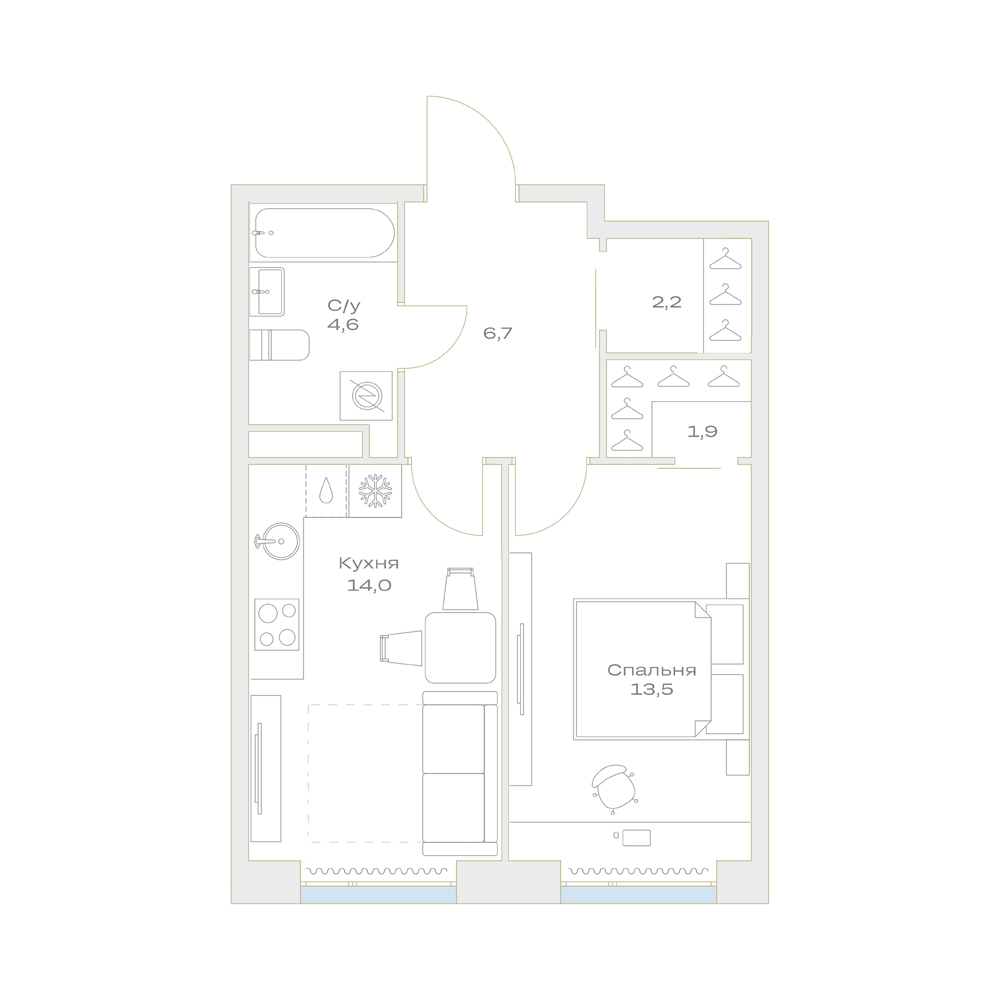 1-комнатная  42.9 м2