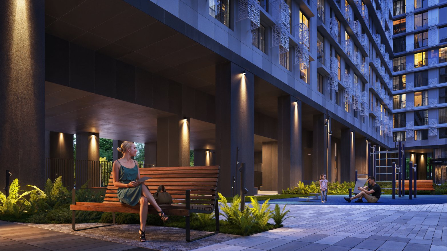 Улицы и зона стрит-ритейла на первых этажах комплекса тоже оживут благодаря динамичной подсветке, которая будет создавать уютную и будто праздничную атмосферу по вечерам. При этом во дворе тоже будет реализована концепция «уютного света». Небольшие светильники на клумбах, вдоль прогулочных дорожек, пергол и зон отдыха подчеркнут природный ландшафт и ночью обеспечат безопасные прогулки для жителей.